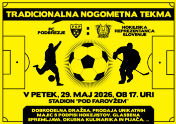 Vabljeni na že 14. tradicionalno nogometno tekmo med FC Podbrezje in hokejsko reprezentanco Slovenije. Dogodek se bo odvijal na nogometnem igrišču ''pod farovžem'', 29. maja 2026, s pričetkom ob 17. uri.