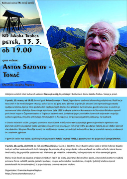 V tretjem večeru Na svoji zemlji bomo spoznali Antona Sazonova - Tonača, ki dejansko živi rek: dober alpinist je star alpinist. Glede na letnik 1937 bogastva izkušenj ne bo manjkalo. Lepo vas bo srečati.