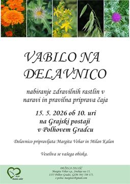 Vabljeni na zadnje srečanje v sklopu predavanj o zdravilnih rastlinah in njihovi uporabi, ki bo v petek, 15. 5. 2026 ob 10. uri. Tokrat bo potekala delavnica nabiranja zdravilnih rastlin v naravi in pravilna priprava čaja. Dobimo se na Grajski postaji v Polhovem Gradcu.