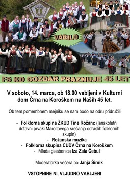 V soboto, 14. marca, ob 18. uri vabljeni v Kulturni dom Črna na Koroškem na praznovanje 45-letnice delovanja FS KD Gozdar. Ob tem pomembnem mejniku se bodo članom skupine pridružili še: