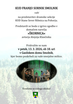 KUD FRANJO SORNIK SMOLNIK vabi na predstavitev dramske sekcije KUD Stane Sever Ribnica na Pohorju.