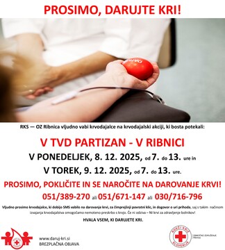 Na krvodajalsko akcijo se je potrebno predhodno naročiti na številko 051 389 270 ali 051 671 147 ali 030 716 796 .