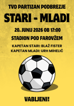 Vabljeni na ogled tradicionalne nogometne tekme ekip Stari : Mladi, ki bo 20. junija 2026, ob 17. uri na nogometnem igrišču ''pod farovžem''.