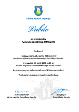 The Kamnik compendium is published by the municipality of Kamnik and is published every two years. It is one of the books that does not become obsolete. It is intended for researchers of Kamnik's past and is one of the few books in which various data on the municipality of Kamnik and its citizens are available. Individuals of different generations participate in the creation of the anthology. The members of the editorial board of the Kamnik chamber are experts from various fields who have carefully read the contributions published in this issue.