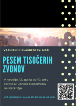 Glasbena maša Pesem tisočerih zvonov. V nedeljo, 12. aprila 2026, ob 10. uri v Župnijski cerkvi Svetega Janeza Nepomuka na Razkrižju.