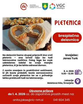 Vabljeni na brezplačno delavnico Pletenica, ki bo 8. aprila od 9.00 - 12.00, v Moletovi hiši.