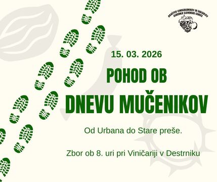 Vabljeni na pohod ob dnevu mučenikov, ki ga organizira Društvo vinogradnikov in sadjarjev Osrednje Slovenske gorice. Zbor pohodnikov pri Viničarji Destrnik v nedeljo, 15. marca 2026, ob 8. uri.