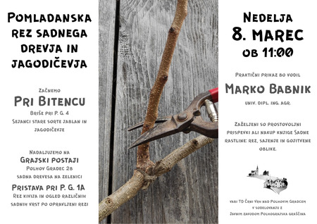 On Sunday, 8. in March 2026, at 11. uri Marko Babnik will explain and show us how to prune fruit trees and berries. We will start at Bitenc, erases at P. G. 4, where we will prune seedlings of old varieties of apple trees and berries. We will continue with the fruit trees in front of the Castle station, and end in Pristava, where we will prune the Kiwi and see different varieties of fruit trees after the cut has been made.