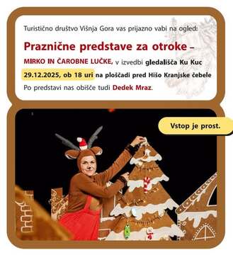 TD Visnja Gori invites you to watch the festive performance for children - Mirko and the Magic Lights, which will take place on Monday, 29. 12. 2025, at 18. uri, on the pavement in front of the House of the Carniolan bee. After the performance, Santa Claus also visits the children.