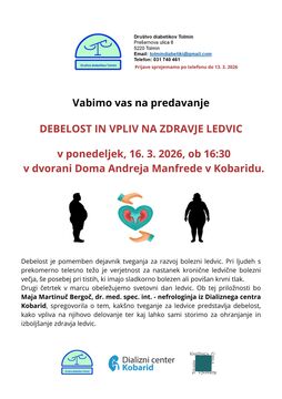Drugi četrtek v marcu obeležujemo svetovni dan ledvic. Ob tej priložnosti bo Maja Martinuč Bergoč, dr. med. spec. int. - nefrologinja iz Dializnega centra Kobarid, spregovorila o tem, kakšno tveganje za ledvice predstavlja debelost, kako vpliva na njihovo delovanje ter kaj lahko sami storimo za ohranjanje in izboljšanje zdravja ledvic.