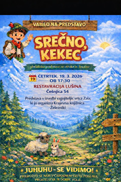 Vabimo vas na predstavo SREČNO, KEKEC, ki jo bodo odigrale vzgojiteljice Vrtca Zala iz Gorenje vasi.Predstava bo v četrtek, 19. 3. 2026 ob 17.30, v Restavraciji Lušina.Vstop je prost!