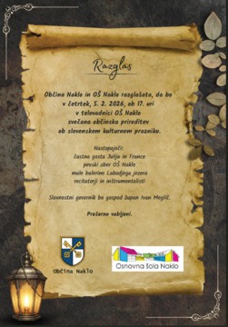 Toplo vabljeni na svečano prireditev ob slovenskem kulturnem prazniku, ki bo v četrtek, 5. 2. 2026, ob 17. uri v telovadnici OŠ Naklo.