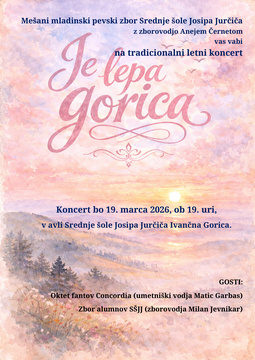 KD Srednje šole Josipa Jurčiča vabi na Tradicionalni letni koncert mešanega mladinskega pevskega zbora z gosti: oktet fantov Concordia in zbor alumnov. Koncert bo v četrtek, 19. marca 2026, ob 19. uri, v avli Srednje šole Josipa Jurčiča Ivančna Gorica.