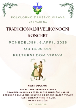 The Folklore Society of Vipava invites you to the traditional Easter concert, which will take place on Monday, 6. in April at 18.00 at the Vipava Cultural Center.