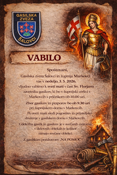 Gasilska zveza Šalovci in župnija Markovci vabita k udeležbi na maši v čast Sv. Florjanu - zavetniku gasilcev, ki bo v župnijski cerkvi v Markovcih s pričetkom ob 10.00 uri.