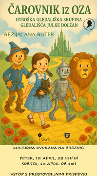 Kulturno društvo dr. France Prešeren Žirovnica-Breznica in Javni sklad RS za kulturne dejavnosti območna izpostava Jesenice vabita na ogled otroške gledališke predstave Čarovnik iz Oza, ki je v okviru gledališke šole nastala pod mentorstvom režiserke Ane Ruter.