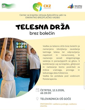 Center za krepitev zdravja Ajdovščina vabi na enkratno brezplačno vadbo Telesna drža brez bolečin, ki bo v četrtek, 12. 3. 2026 ob 19.00 v telovadnici OŠ Goče.