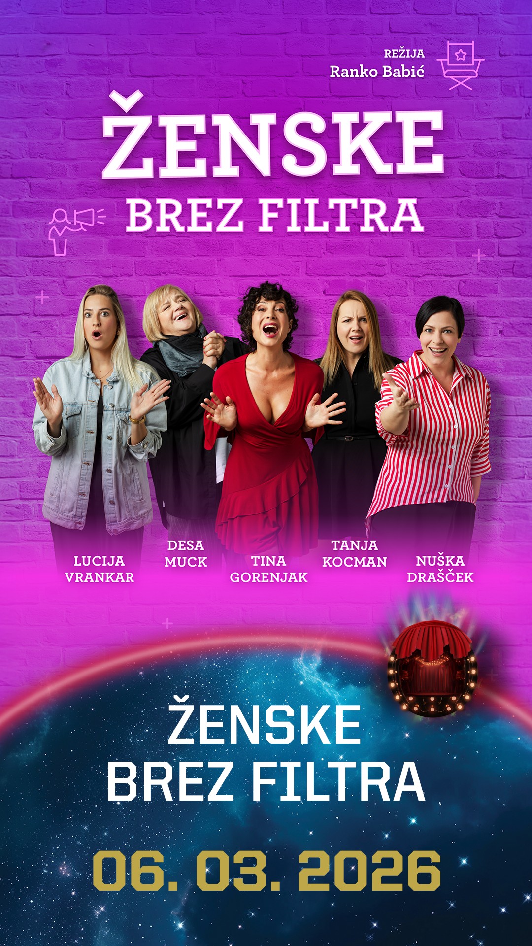 Ženske brez filtra je komedija, kjer 5 žensk brez zadržkov govori o temah, ki so marsikomu blizu, a se jih redko kdo upa naglas izreči.